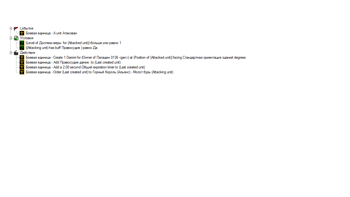 Здравствуйте знатоки вот скрины умения которое я создал суть умения в том что когда герой бьёт шанс 20% что на него наложится баф. Под бафом герой каждым ударом наносит доп урон и оглушает цель это я сделал с помощью дамми и молота бурь, но ! у меня получается что когда на герое этот баф то и удары по цели героя и все юниты которые бьют героя при каждом ударе оглушают цель с помощью дамми и скила при том что я спецально сделал урон молота 0 и когда герой под этим бафом бьёт то молот вылетает и наносит 0 урона а когда этого героя бьют то вылетает молот стандартный и наносит 100 урона. Что я только не делал и attacking unit менял на attaked вот как на скрине сделал даже выборочно именно какой юнит должен как бы при ударах воспроизводить эти действия в тригере, но всё равно под этим бафом в героя летят стандартные молоты бурь, я даже даммиков разных сделал, Пожалуста разьясните мне что я сделал не так.(Извиняюсь если скрины ужасные первый раз их вставил вообще в интернет )