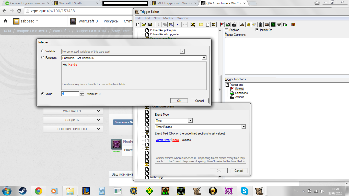 Господа, создал таймер с индексом, на каждый каст спелла к индексу прибавляется 1 и запускается таймер. Однако, при создании 2 триггера, столкнулся с тем, что в Event type - Time - Timer expires при выборе моего таймера в окне индекса нельзя выбрать ни 1 переменной. Подскажите выход.
