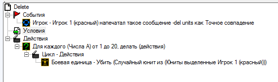 Событие: Игрок 1 напечатал сообщение: =Удалить юнита - как точное совпадение