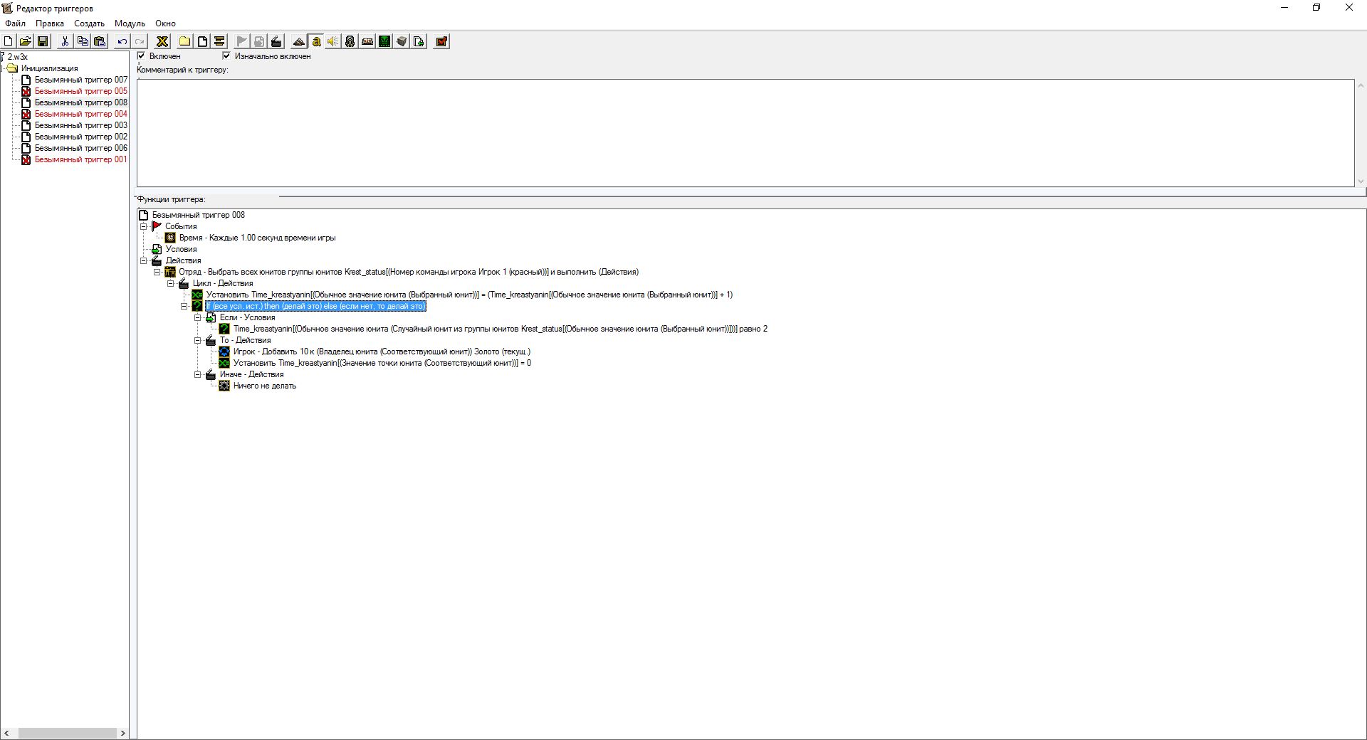 Мне нужно сделать то, что если какой-то юнит из группы Status_krestyanin имеет time 10, то time именно у этого юнита будет 0, и добавление золота игроку.