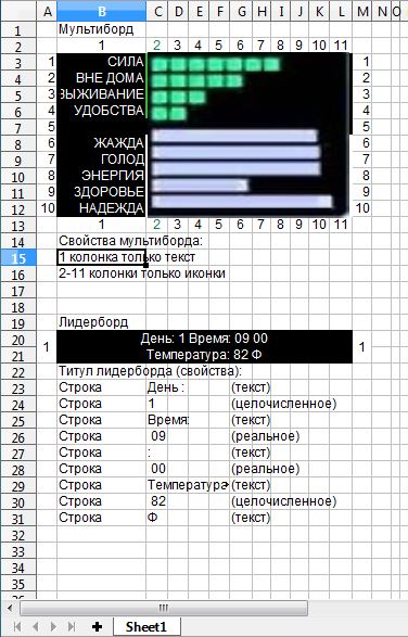 б)а вот с меняющимися еще сложнее, где опираясь на голод(игровое золото) и жажду(дерево) оно будет уменьшаться со временем и это должно отображаться полоской статуса в мультиборде. тоже самое про энергию/усталость(ману персонажей) и здоровья.