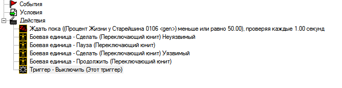 Почти так, события нет и триггер никогда не сработает, и действие "ждать пока процент жизни", не выполнится, есть сразу событие - Жизнь или % жизни определённого юнита меньше такого-то числа.