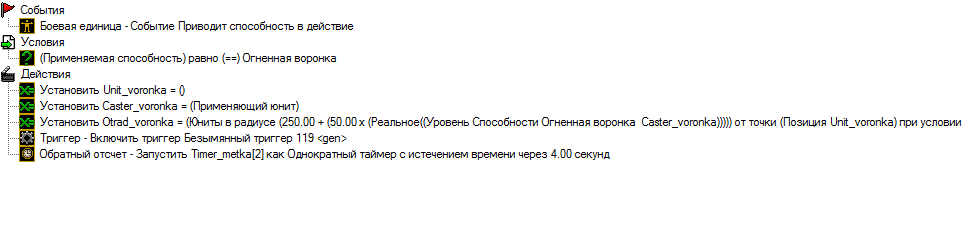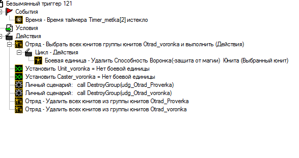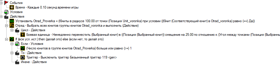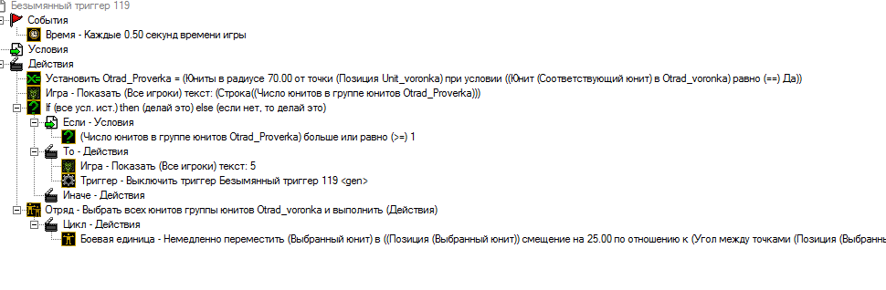 Понятно,с русификатором я привык.А проблему я нашел, в отряде проверка нет юнита, для выключения триггера нужно, чтобы хотя бы 1 был в отряде, а появится он в отряде если рядом есть юнит из отряда воронка, но юниты есть, условия соблюдены, но почему-то не заносится. Статью прочитаю.