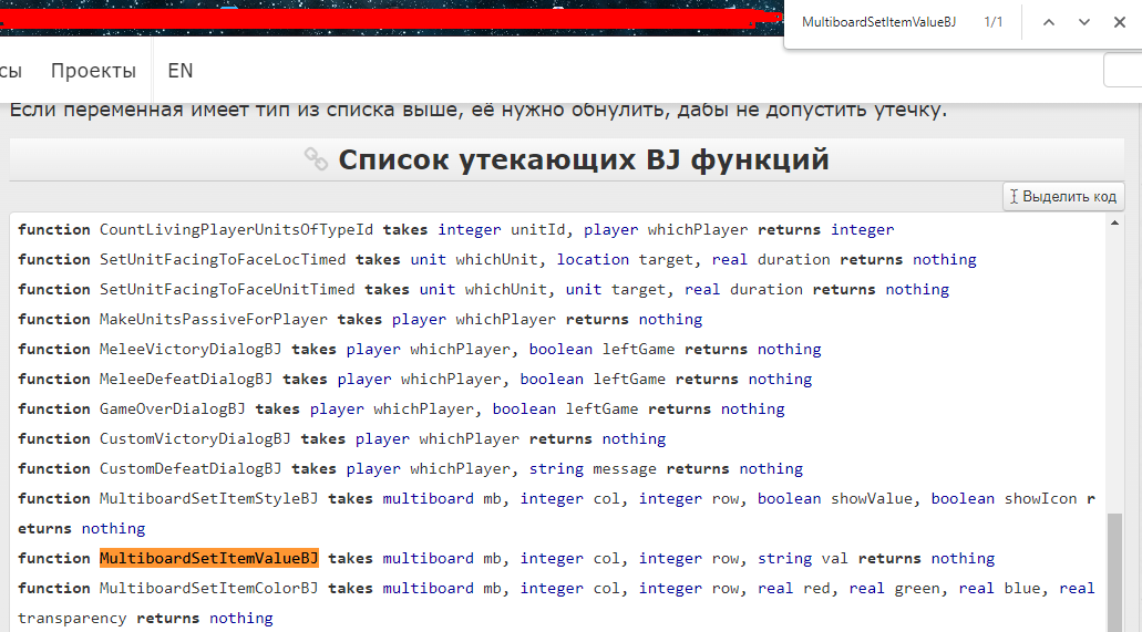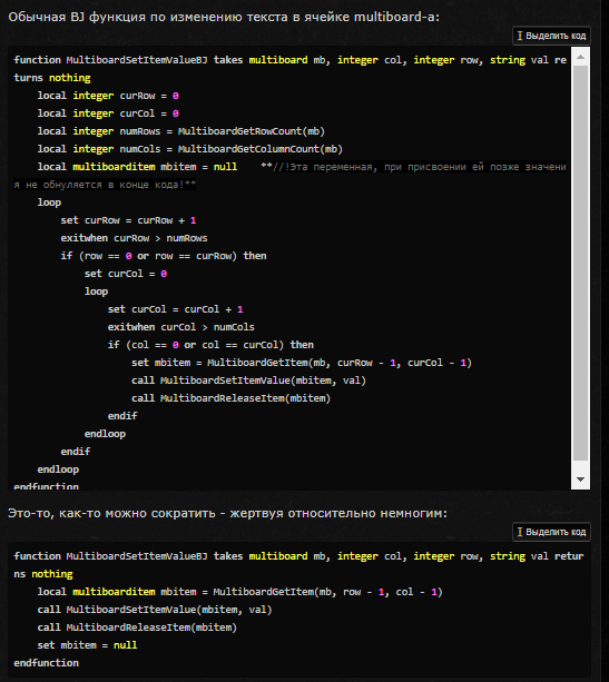 Там в конце приведен "Список утекающих BJ функций", в числе которых нашел "MultiboardSetItemValueBJ"