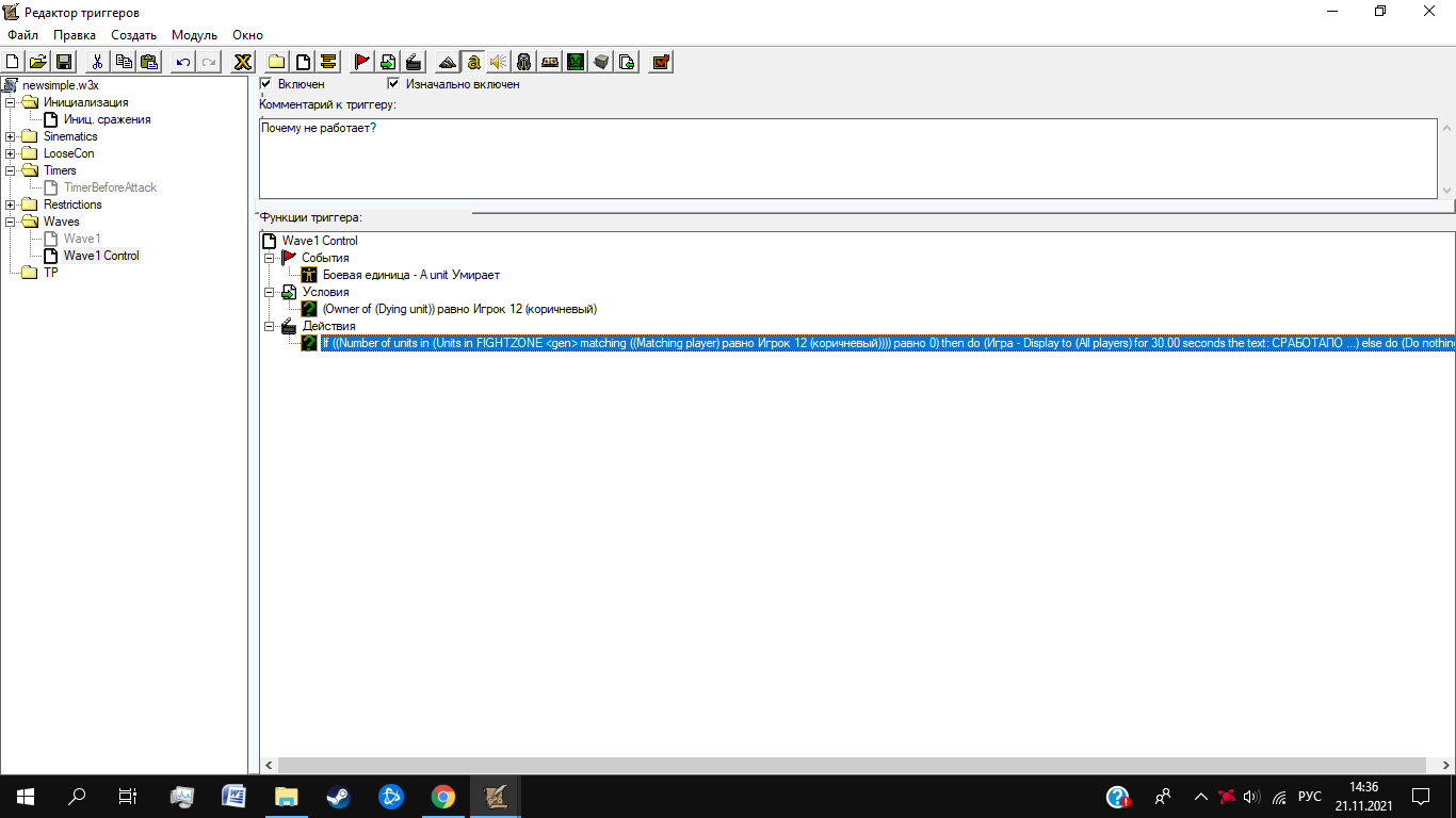 Что нужно: должно происходить некое событие после того, как последний из нападающих мобов будет убит и в зоне не останется ни одного юнита Коричневого игрока.