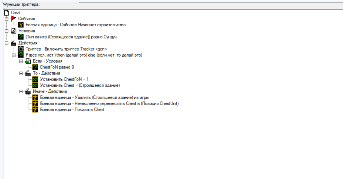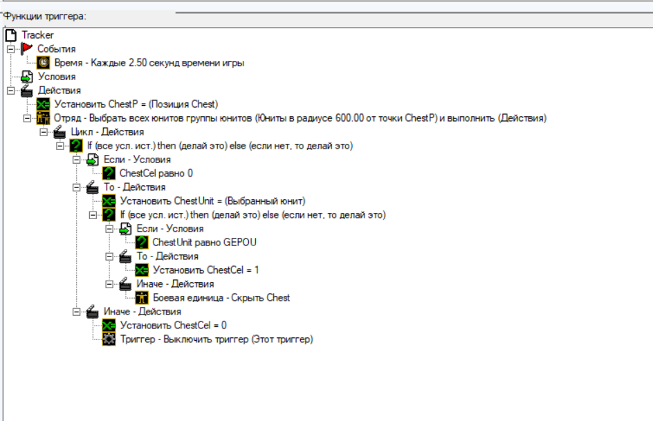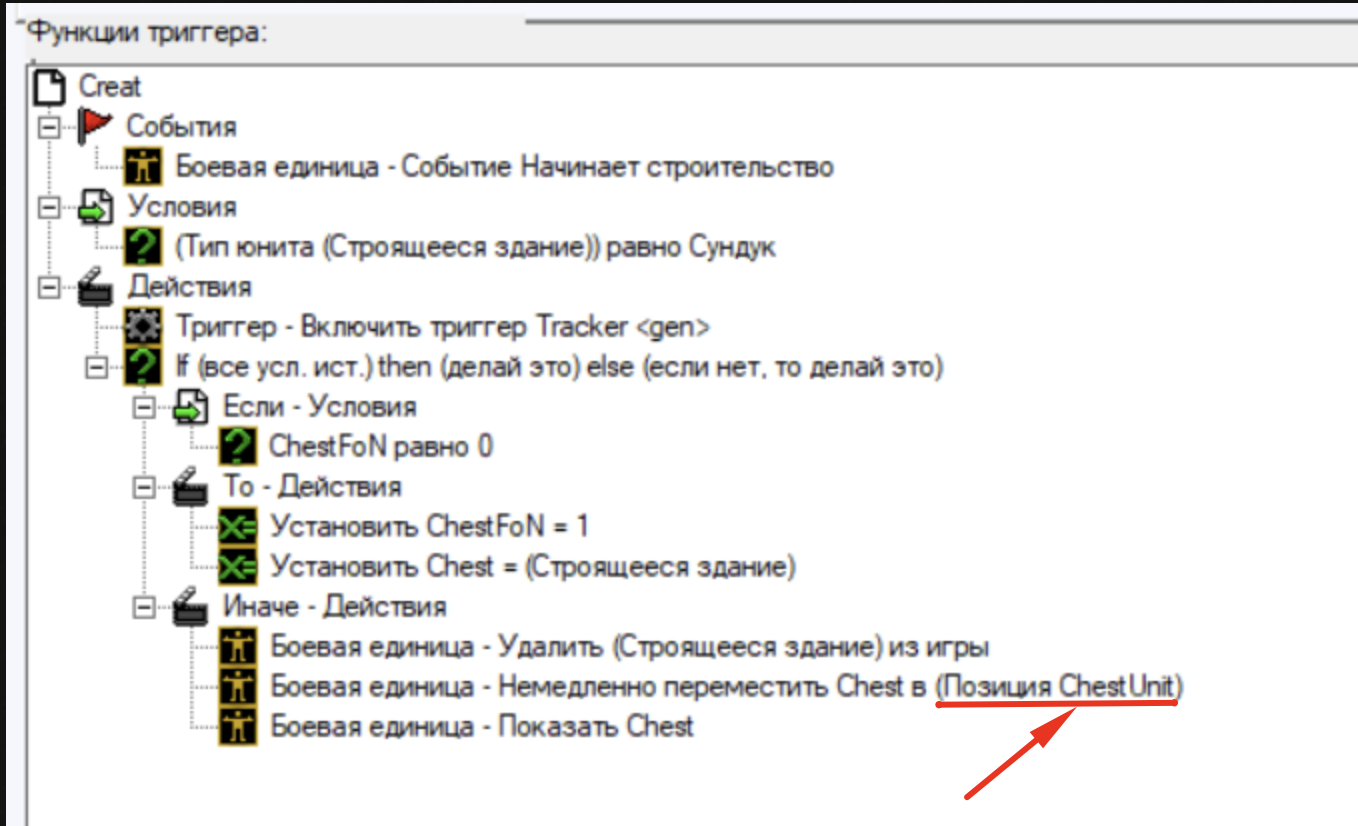 Суть триггеров в том что первый призывает сундук,а второй считает расстояние между персом и сундук,если расстояние большое то сундук скрывается.