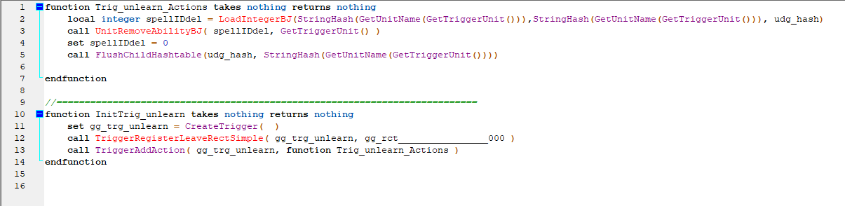 Решил сделать способность, которая будет копировать другие способности, типо ульты Рубика. Для начала , что бы протестить механику сделал область. при вхождении в которую юниту дают способность, а когда он выходит, то способность убирают.(спелл в другом месте записывается в переменную). Столкнулся с проблемой , что если переменна перезаписывается за это время , то и спелл не удаляется. решил попробовать через хендл таблицу. Но всё равно не удаляется способность, если меняется переменная. Сразу извиняюсь за ваши глаза, я только начал осваивать код, раньше всё делал на GUI.