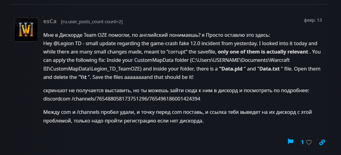 Hey Legion TD - small update regarding the game-crash fake 12.0 incident from yesterday. I looked into it today and while there are many small changes made, meant to “corrupt” the savefile, only one of them is actually relevant . You can apply the following fix: Inside your CustomMapData folder (C:\Users\USERNAME\Documents\Warcraft III\CustomMapData\Legion_TD_TeamOZE) and inside your folder, there is a "Data.pld " and "Data.txt " file. Open them and delete the "\\t ". Save the files aaaaaaaand that should be it!