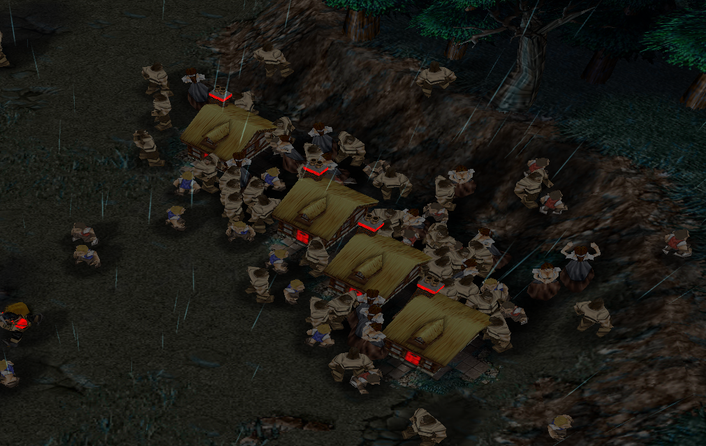 Слева крестьяне, по триггеру должен 1 крестьянин заспавниться около любого дома, спавнится 10 у каждого