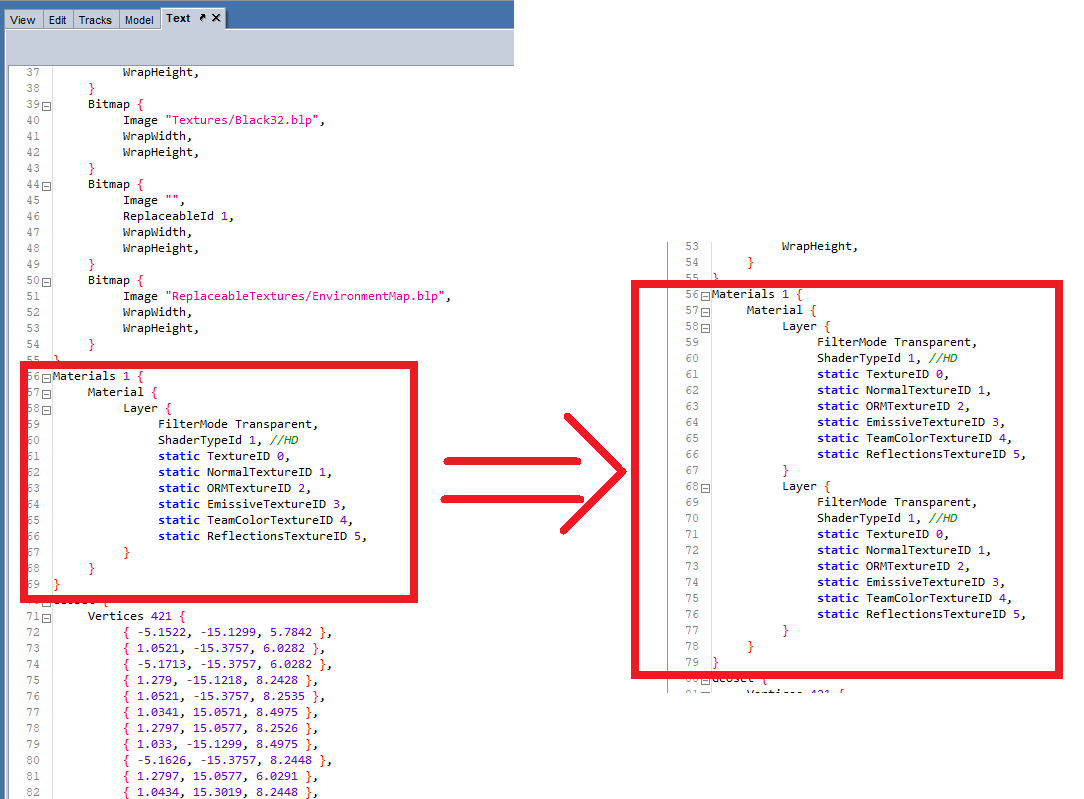У меня настолько криво работает ретера, что этим способом новая вкладка не появляется, наоборот, встроенный оптимизатор строк в ретере просто удаляет эти строки при сохранении модельки в mdx, а формат mdl вар не всегда читает, если моделька "сложная" xDD. Ну буду разбираться, что с ретерой не так)