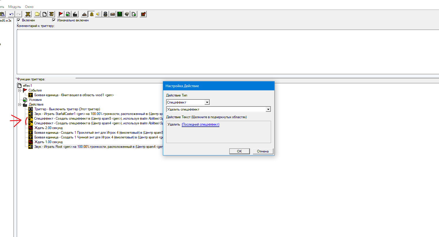 Здравствуйте, у меня в триггерах создается несколько спецэффектов в конкретных областях, через 3 секунды я хочу удалить их всех разом, но доступно только последний как на скрине, не знаете как сделать , чтоб можно было выбрать всех или отдельно по областям?