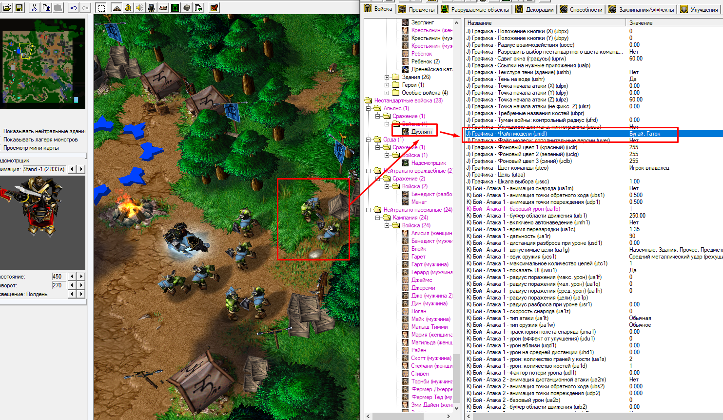 vkuser489748171, так-же заметь, что в карте могут быть особые юниты, сделанные специально для карты. Их можно найти в редакторе объектов как нестандартные данные. Можешь прямо там поменять им модельку, звуки, имена и тд. К примеру пехотинцы на фоне, что тренируются (дуэлянты).