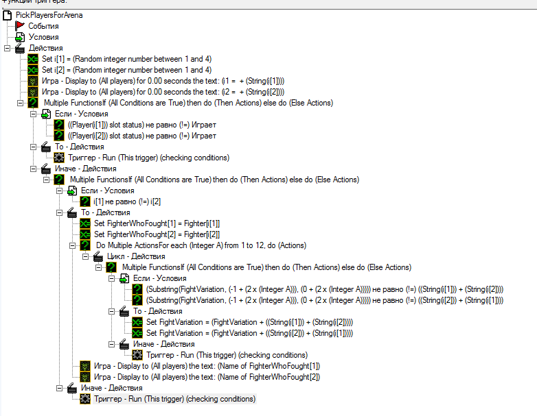Система должна подбирать игроков, которые будут сражаться на арене. Всего возможных игроков: 4. Проблема в том, что эта система подбирает игроков до тех пор, пока в "i1" или в "i2" не будет любой номер игрока, который в игре и ей абсолютно не важно, кем является второй игрок. Если в игре будет Игрок под номером 1 и Игрок под номером 2, то при выпадении, допустим "i1 = 1" и "i2 = 3", игрок 1 переместится на арену, а второй нет и триггер завершится. Я подозреваю, что дело в условии, но я не знаю какое условие поставить. Помогите. Карта прилагается.