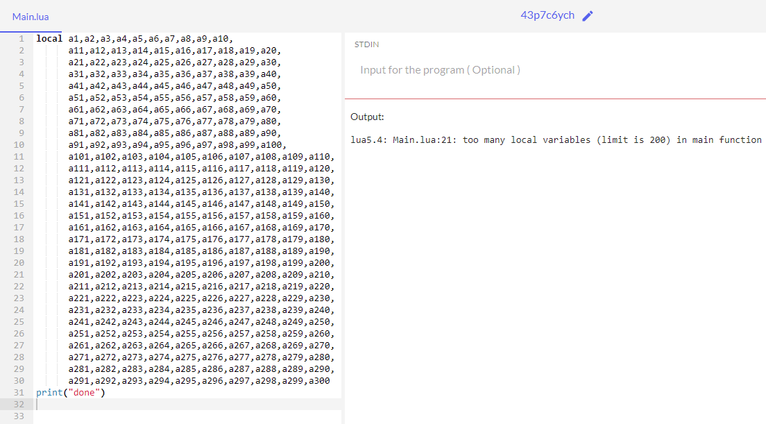Кто-нибудь сталкивался с ограничением Lua в 200 локальный переменных в главном коде? Есть какие-нибудь костыли для обхода данного ограничения?