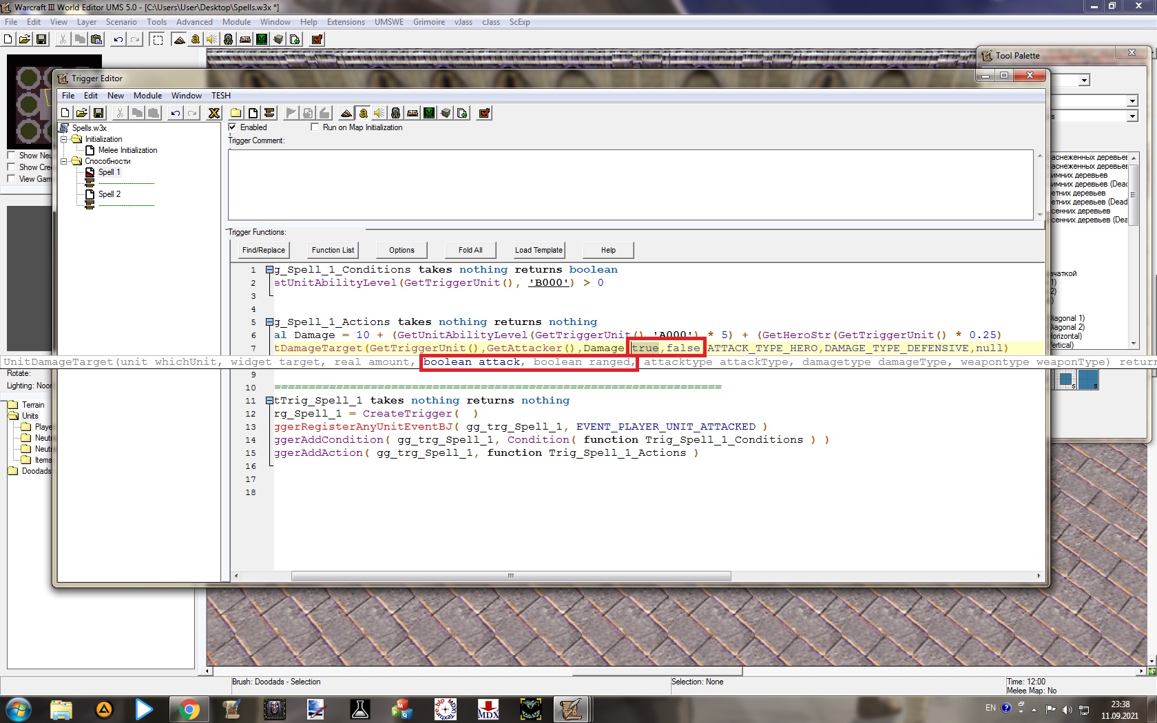 UnitDamageTarget(наносящий урон,таргет,кол-во урона,логический атака, логический дальняя, тип атаки, тип урона, тип оружия)