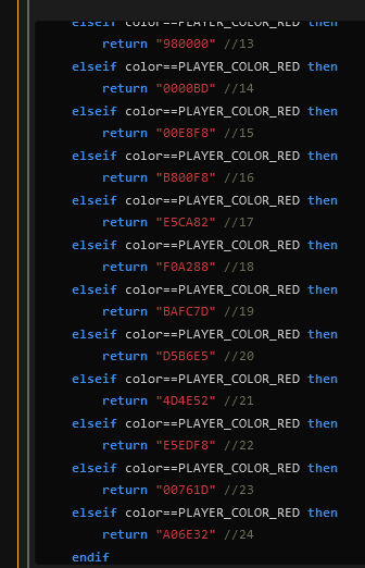| 00 | 01 | PLAYER_COLOR_RED | FF0303 | |cffFF0303|r | 255,3,3 |