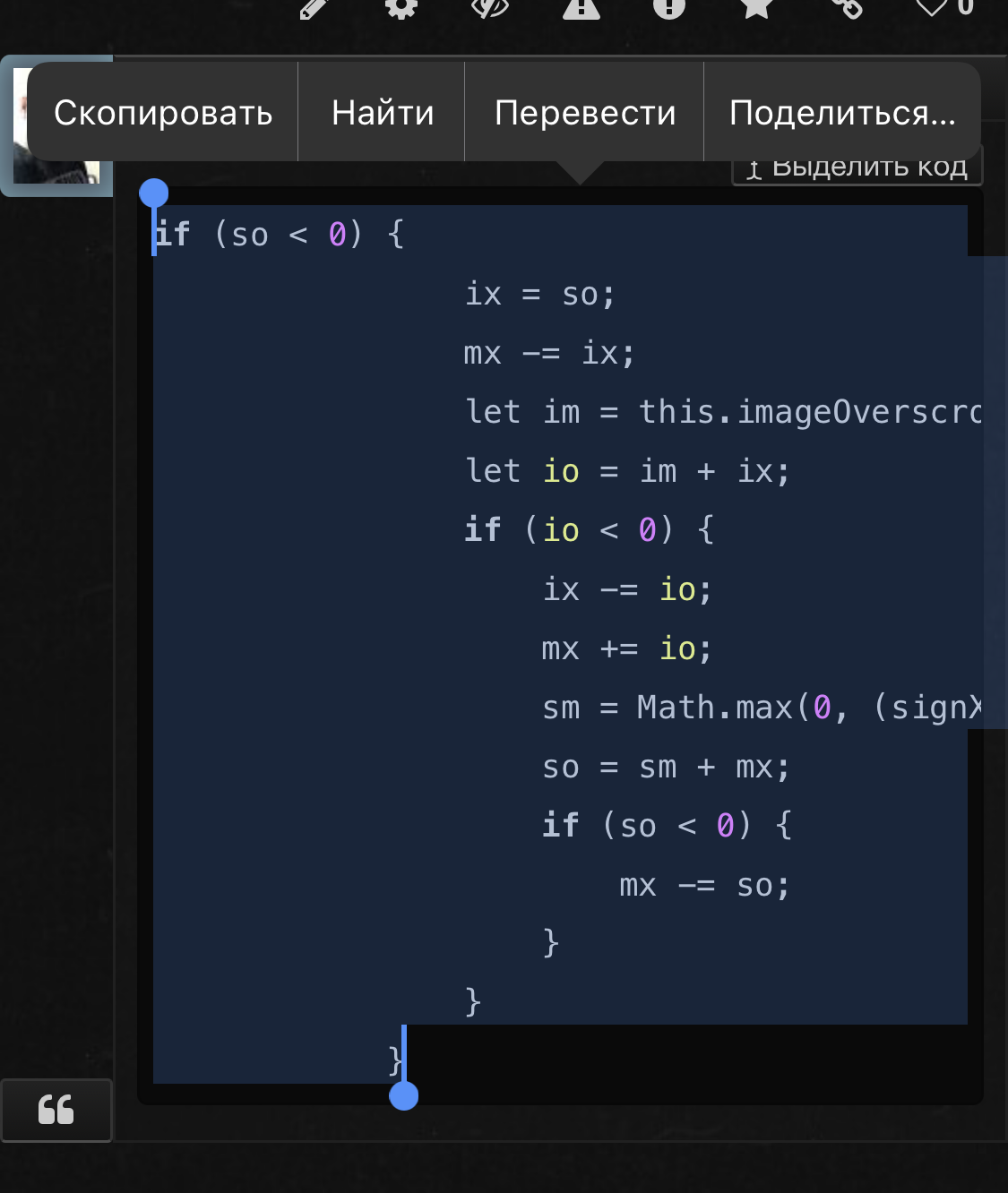 iphoneX - Чтоб выделить код нужно нажать "Выделить код" и сразу же тапнуть по блоку кода.