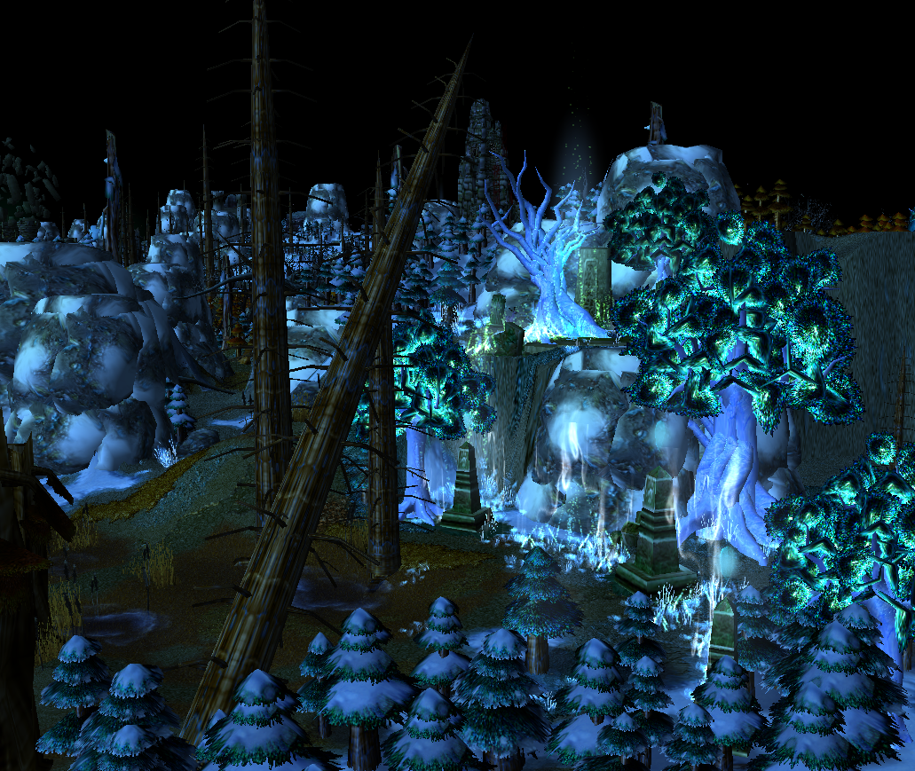 В нижней части разместим три обелиска, что будут обозначать границу владений Эльфов. Вдоль границы течет магический ручей, у которого растет светящаяся трава. Также добавляем пару деревьев. К деревьям добавляем ретекстуренную модель мирового древа, чтобы сделать более выразительные корни. Работаем с текстурами земли: до святилища – желтая трава и опавшая листва, после – тайлы с налетом инея и снега. Наконец добавим модель самого «барьера», а также несколько моделей сосен в локации с пожухлой травой.