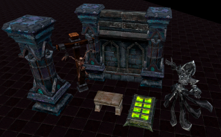 -Декорации: каменный стол, древняя стена, древняя колонна, ядовитая решётка, крест с трупом, статуя Кел'Тузада. (Даже не спрашивайте)