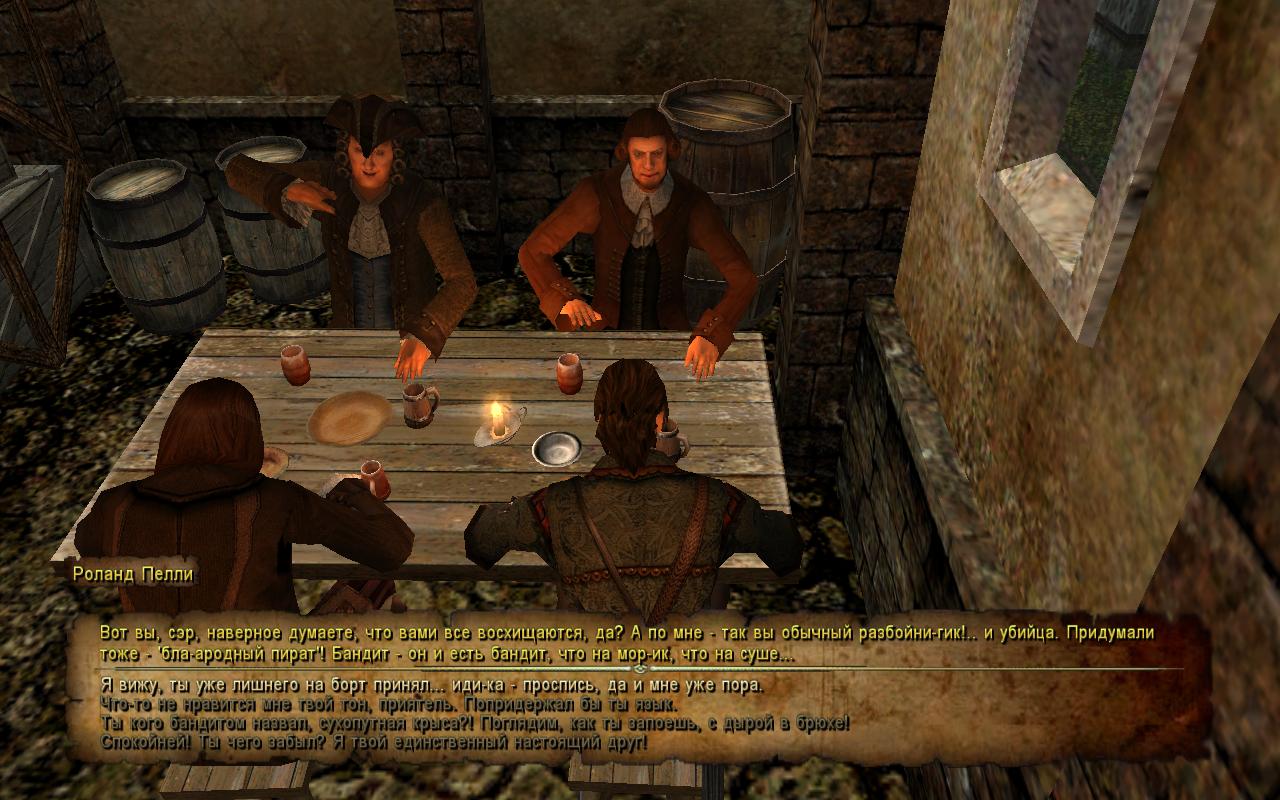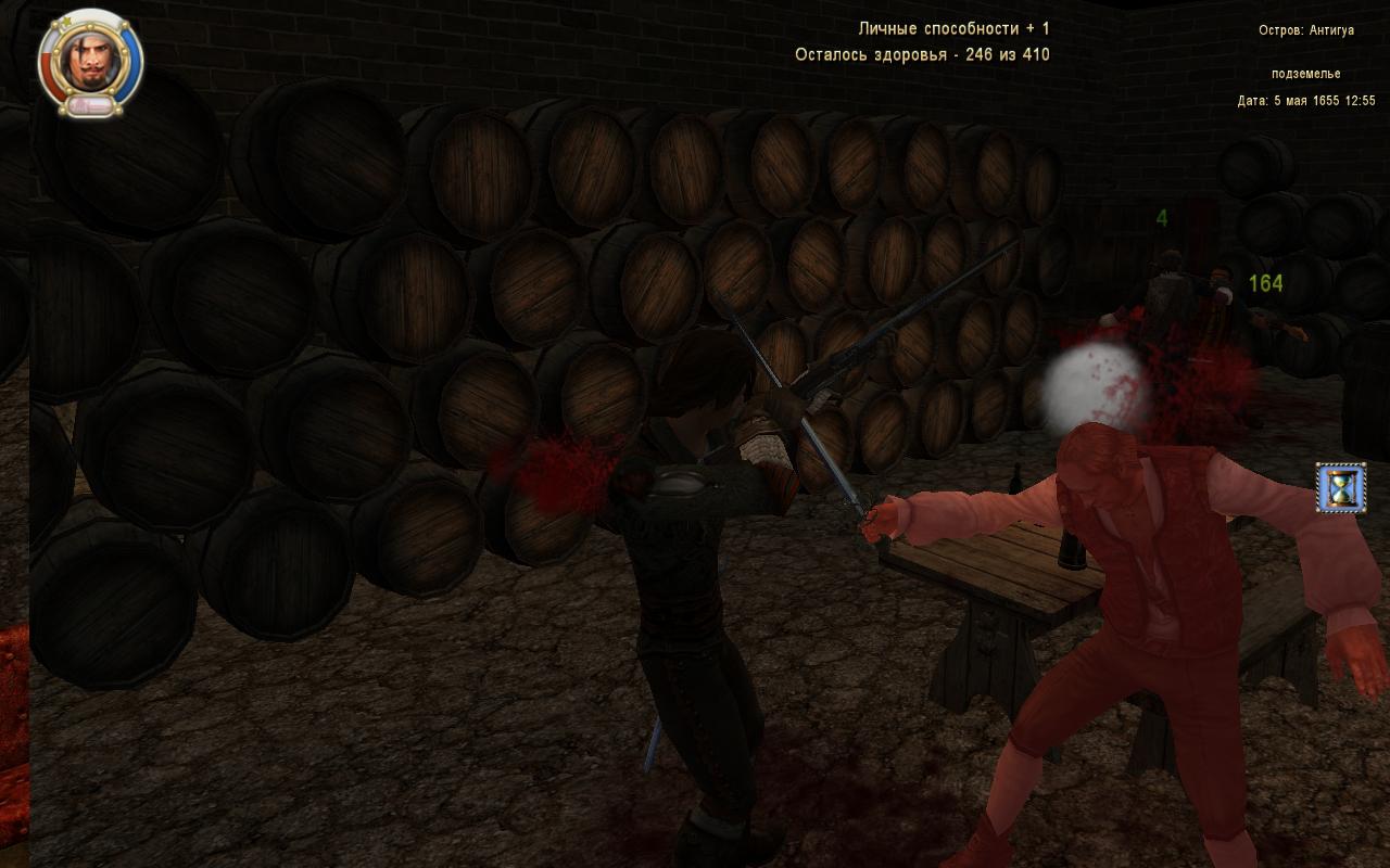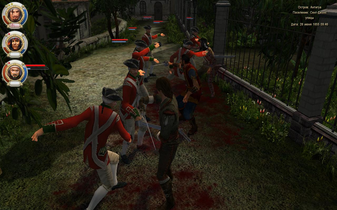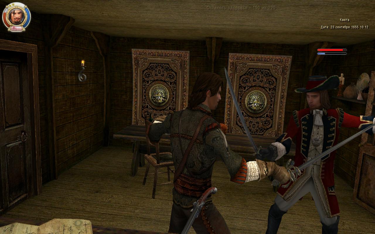 - Переработанная система фехтования. На этом я хотел бы остановиться поподробнее. Во всех предыдущих «Корсарах» работал один и тот же принцип: выстроить врагов в узком проходе и начать бить быстрыми ударами первого из них. Как только закончится энергия – уйти в блок, подождать и снова бить. Таким образом, можно было спокойно захватить огромный военный корабль с экипажем over 900 кастильских головорезов на маленьком люггере или шлюпе, с командой в 30-40 салаг. После изменения системы фехтования, все стало иначе. Блок – очень сомнительная и ненадёжная защита. Почти любой противник пробивает блок как сильными, так и легкими ударами. Единственный выход – отвечать финтом или парированием на большинство выпадов врага, успевать при этом нанести дополнительный удар, и самому не попасться на финт. Узкие проходы тоже почти не меняют ситуацию – враги просто проталкивают героя на открытую площадку. Таким образом, фехтование стало гораздо сложнее, но интереснее и реалистичнее. Приходится следить за каждым движением врага, парировать, отскакивать, отстреливаться – всё это создаёт особую атмосферу боя.