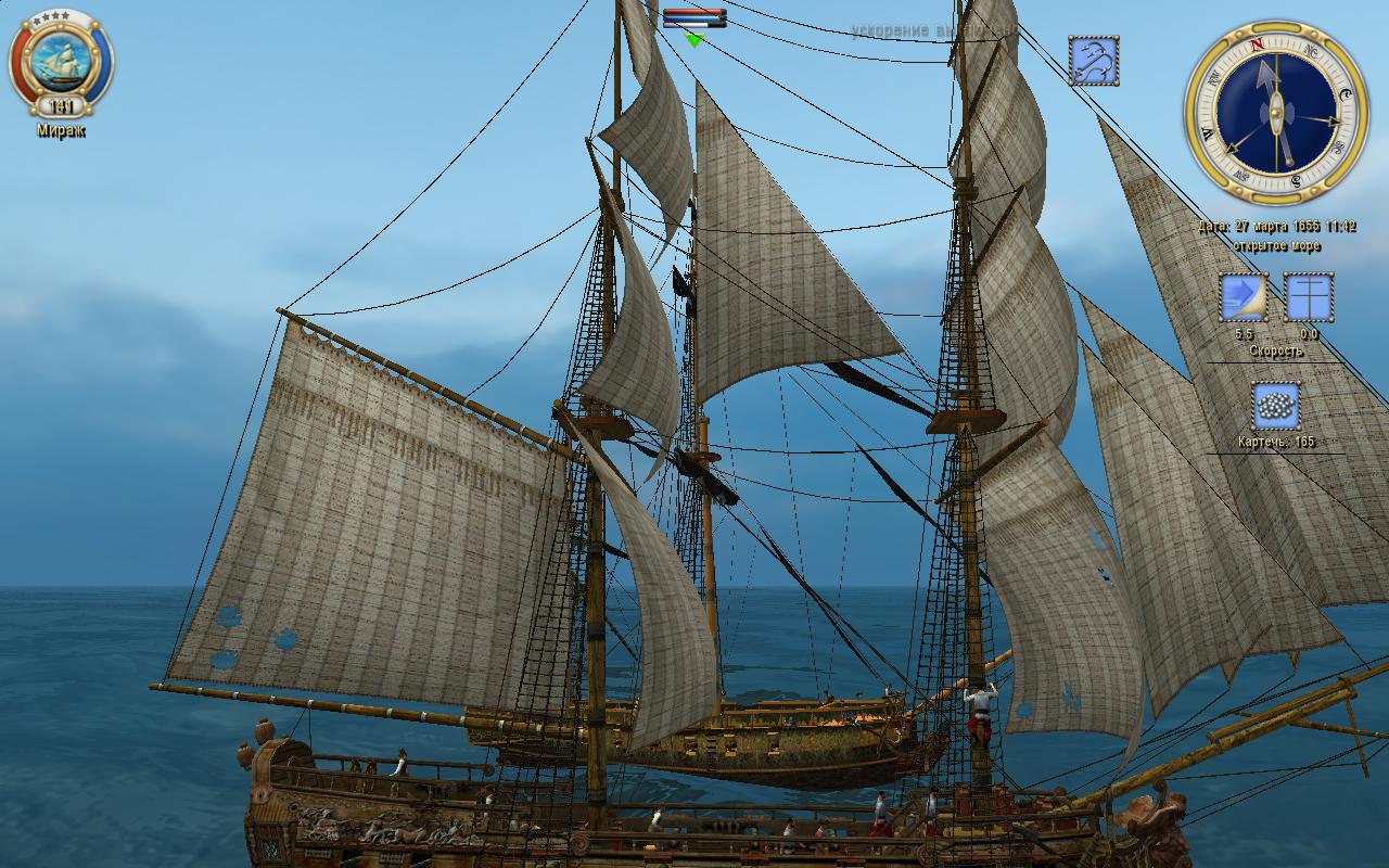 - Новая система движения парусников. Опять-таки, в прошлых играх работало в корне неверное для движения парусных кораблей правило – «максимальную скорость судно развивает при попутном ветре». То есть, все корабли, независимо от расположения и геометрии парусов, развивали максимальную скорость только в одном направлении, что делало морские бои довольно скучными. В «ККС» же введена новая характеристика корабля – курсовой угол. Корабли с косыми и с прямыми парусами двигаются совершенно по разным принципам, что придает морским сражениям реалистичности и всегда оставляет шанс игроку (или компьютеру) уйти от врага при определенном наборе парусов.