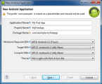Compile With это версия платформы на который вы будите компилировать своё приложение. По умолчанию выбрана последняя доступная версия Android в вашем SDK. (Это должен быть Android 4.1 или выше; если эта версия у вас недоступно, то вы должны установить её, используя SDK Manager). Вы можете продолжать создавать своё приложение, поддерживающим более старые версии, но компиляция для последней версии дает возможность использовать новые особенности и оптимизировать ваше приложение для более удобного использования на новейших устройствах.