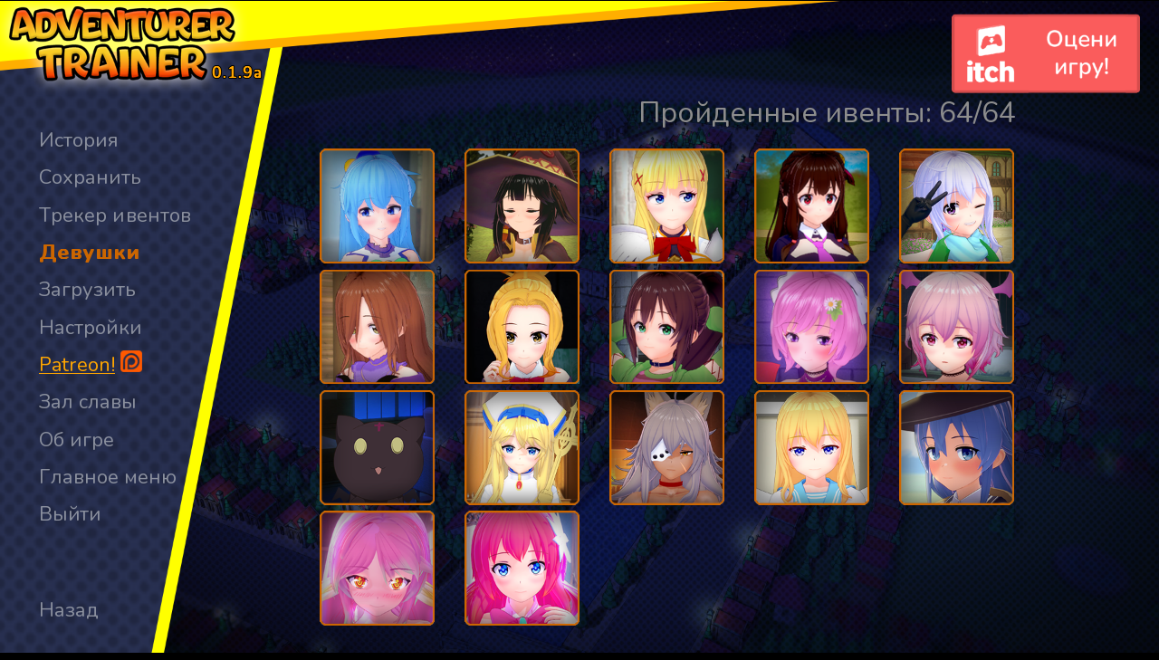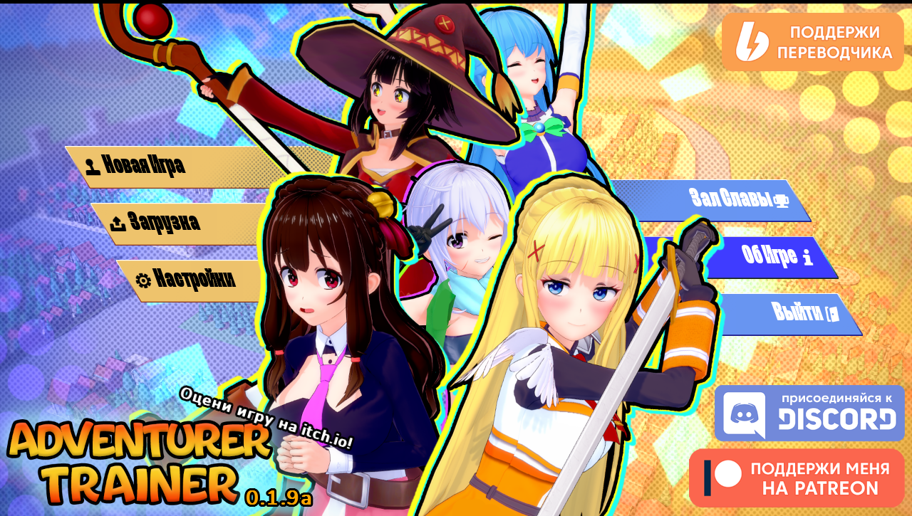 Adventurer Trainer - это фанатская NSFW-пародия, являющаяся Симулятором Свиданий/Визуальной Новеллой с элементами RPG, действие которой разворачивается в вымышленной вселенной, основанной на Коносубе и других играх. Ты встретишь знакомых персонажей, отправишься в захватывающие приключения, разгадаешь невероятные тайны и многое другое!