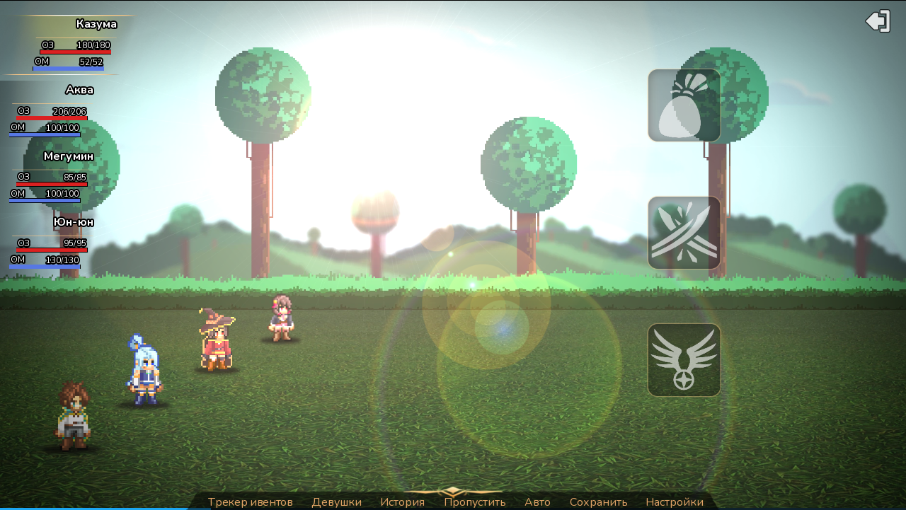 Сюжет старается соответствовать событиям из аниме «Коносуба», и оригинальные персонажи действительно хорошо передают свои образы. Выполняя ивенты, мы общаемся с другими героями, наслаждаемся шутками Казумы и стараемся найти деньги, чтобы выплатить долг.