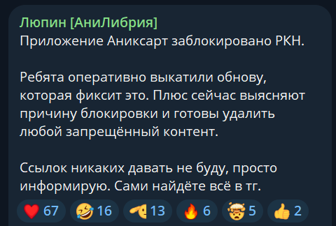 Вчера Люпин (бывший руководитель проекта AniLibria) сообщил в своём Telegrame, что приложение Anixart было заблокировано РКН на территории РФ.
