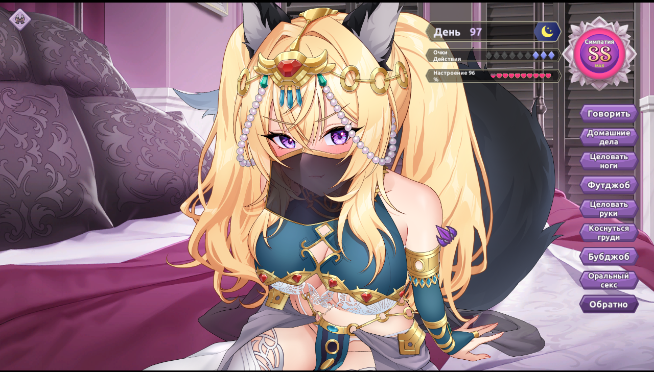 Настроение - это настроение нашей госпожи Дайну. В главном экране игры у нее будет меняться выражение лица. Само собой, что это также и влияет на выполнение того или иного действия в кнопке ОБЯЗАННОСТИ или во время провожение с ней спальных утех. Чем ниже - тем плохо.