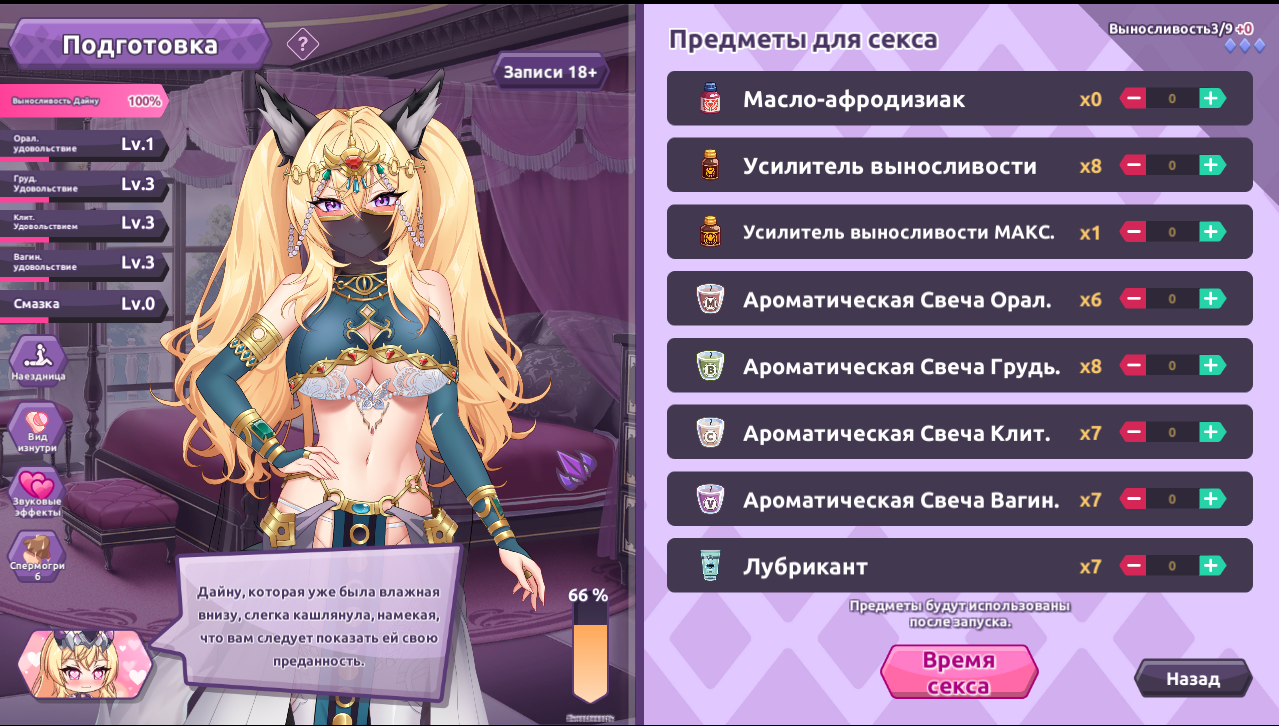 Можно применять различные смазки, пару предметов, на выбор есть три позы и небольшой спектр действий. Некоторые функции тут недоступны, а некоторые функции могут не рабоать в одной из поз. Можно менять одежду - какую оставить, а какую нет. Большой выбор музыки, некоторые действия во время утех. Есть чат, где наша принцесса описывает твои действия - хорошо или не хорошо. Анимация здесь присутсвует, звуки тоже. Есть шкала удолетворения и шкала выносливости (на сколько Дайну хватит во время Н-сцен)