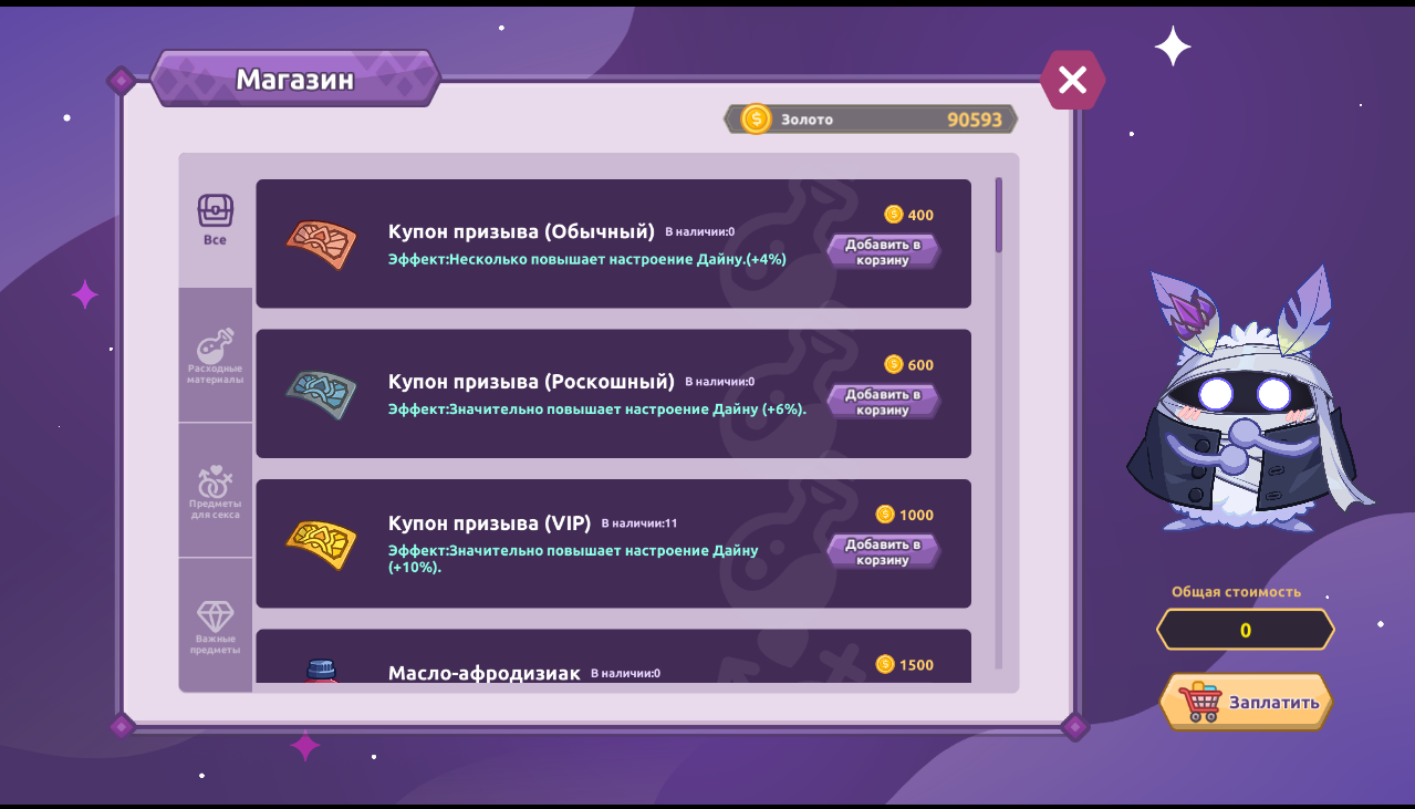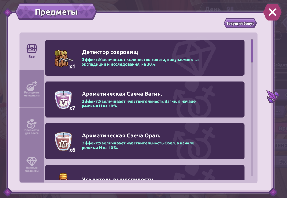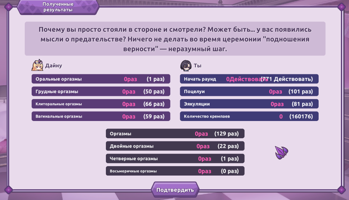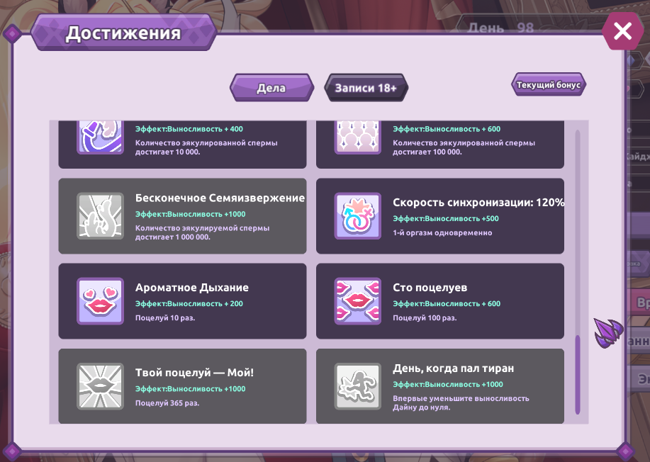 Покупка трех видов категории предметов, статистика по утехам, разные пройденные ивенты для пересмотра хентай сцен с нашей принцессой, другими персами или проявление симпатии к главному герою.