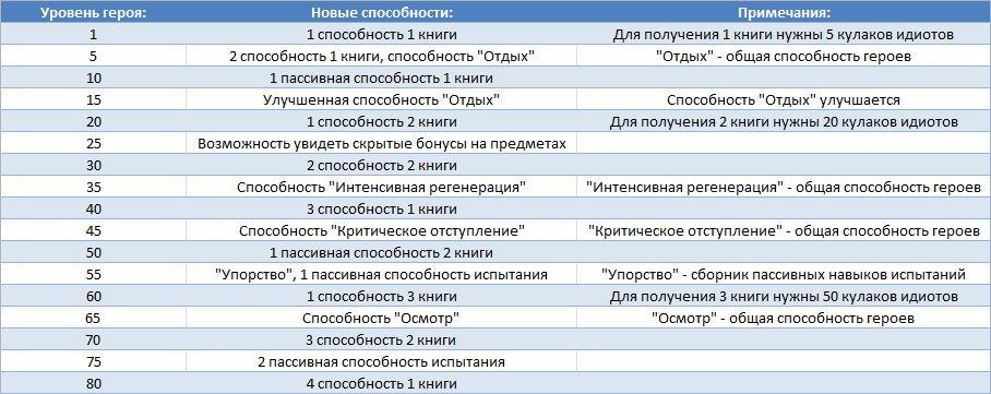 Как видно из этих двух картинок, количество общих умений у стокового и топового героя сильно отличается. По мере увеличения уровня героя, увеличивается и количество общих способностей. Каждая способность открывается на определенном уровне. Подробнее можно узнать из этой таблицы: