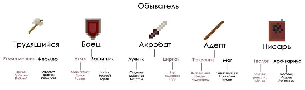 Таким образом, можно будет создать собственного и уникального персонажа. Например: Обыватель -> Боец - > Атлет - > Мистик, получаем Боевого мага, а если персонаж принадлежит Священному союзу, он может стать "Волшебником фиолетового пламени", таким образом став самым могущественным боевым магом.