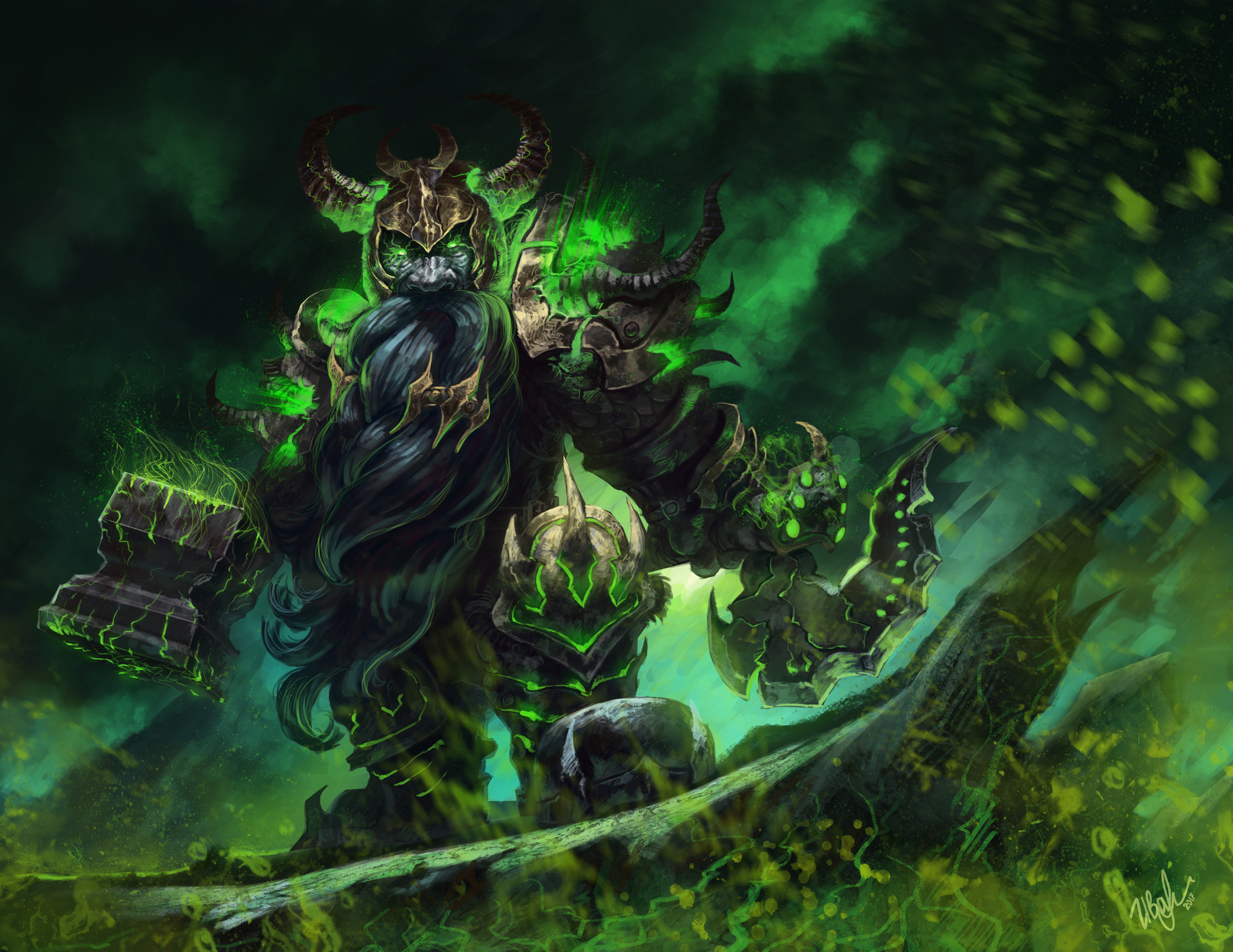 Bergi, Ну хорошо. Вот. Здесь необходимо заменить зелёные тона скверны на синие и белые цвета зимы, Зелёные частички на снежинки итд. А зловещего дворфа на заменить на дворфийку приложенного также ниже. Причём оставить её в такой же позе. В руках должны быть топоры.