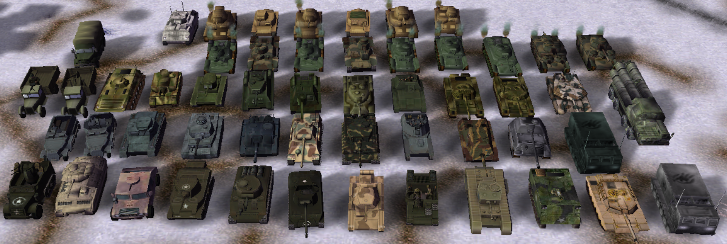 Из воздушной техники есть: штурмовики, вертолёты, бомбардировщики и истребители. Из наземной: зенитки, транспорт, бронетранспорт, артиллерия и ракетные системы. Так же есть различные виды танков. Бывают скорострельные, быстрые, прочные и тд.. Ну и несколько типов пехоты, которая хороша против определённых целей. Например, штурмовик сильнее солдата с дробовиком а он в свою очередь сильнее тяжелого пулемётчика который сильнее штурмовика, ну принцип вы поняли. Так же если у вас будут скажем 1-2 солдата с базуками, они могут помочь вашему танку или бронетехнике одолеть более сильную технику.