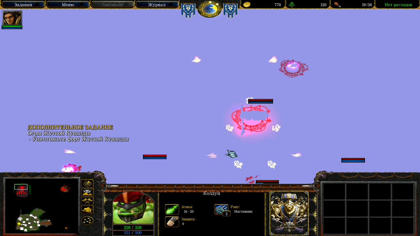 - После кат-сцены боя войск Тралла и орков скверны, юниты остаются видны, и оказывается, что на карте 2 Тралла. Забавно то, что орки скверны победили. Сделай бота, чьи юниты в кат-сцене невидимым для игрока.