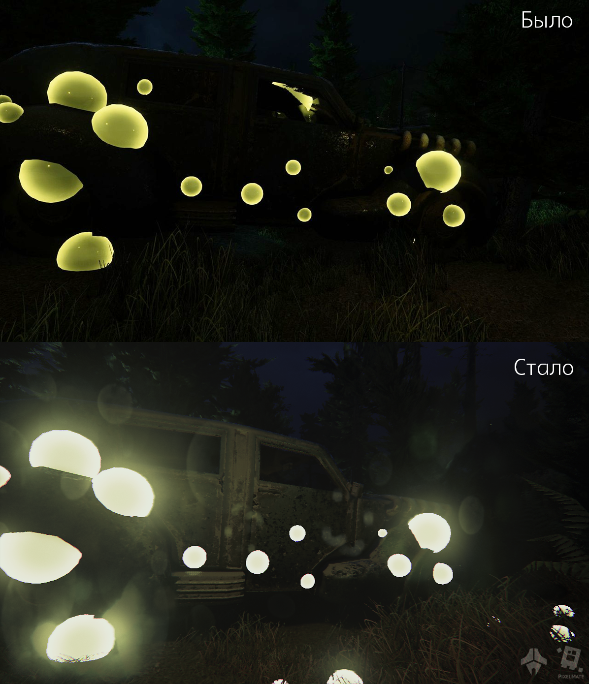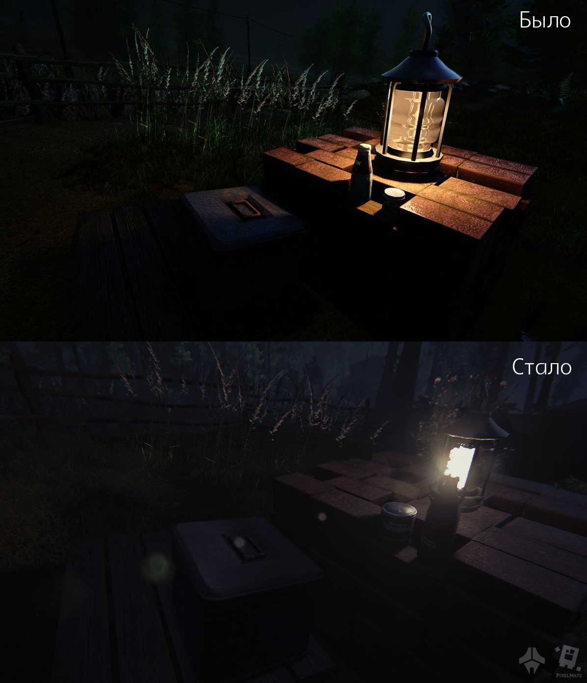 -На 2 скрине, где фонарь стоит на ящике, очень резкий переход - одна грань ящика полностью освещается, соседняя же совсем черная. Это не реалистично.