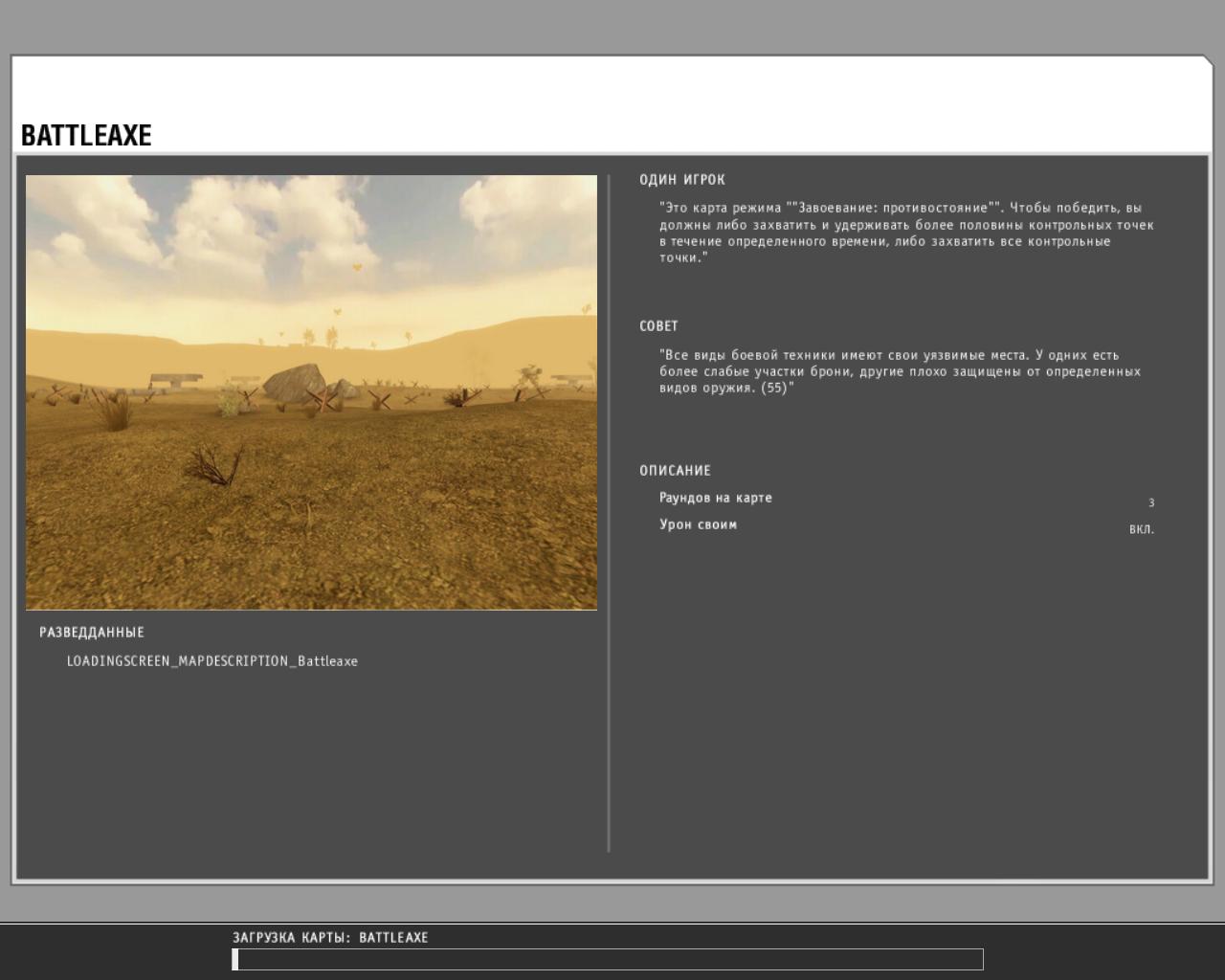 Финальная версия карты Battleaxe 2008 года. Карта представляет собой конверсию пользовательской карты Battlefield 2 от - imtheheadhunter. Кто не помнит карту Battlefield 1942 Battleaxe? Карта, на которую играют первой в режиме кампании, а также карта, которую ненавидят многие игроки. На самом деле, о Battleaxe много говорить не нужно. Действие карты разворачивается в долине, окруженной горами в африканской пустыне. По сей день мало что изменилось, кроме того, что бункеры и здания стали более современными, используется самое современное оружие и боевая техника и что погода не только плохая, но на этот раз действительно идет дождь. В Battleaxe 2008, как и тогда, по-прежнему приходится захватывать одну линию бункера за другой и, конечно же, удерживать ее.