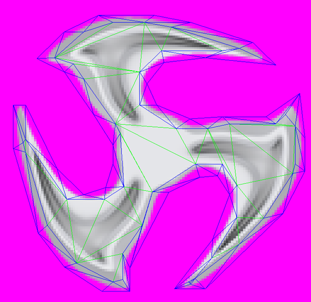 На построение модели для картинки с разрешением 512 на 512 пикселей уходит около одной секунды на процессоре AMD A10-5700. Алгоритм построения моделей очень прост, вкратце он сводится к следующему. Сначала создается модель в виде квадратной решетки с узлами в каждом пикселе, а потом она упрощается.