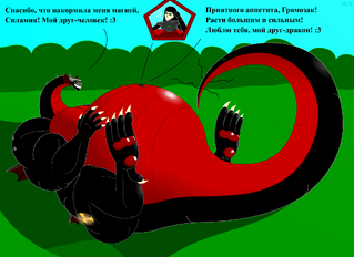 Дракон закрыл глаза, не желая вспоминать свою недавнюю смерть. Раскрыв большую пасть, полную острых, белоснежных зубов ("Вот бы мне такие зубы", - немного позавидовала Громозаку Силамия, видя два ряда его достоинств), монстр слегка сгорбился, присев. Левой рукой закинув в рот подаренный Силамией кристалл маны, дракон с шумом закрыл пасть, медленно глотая артефакт, немного раздувший ему длинную шею, в месте нахождения. Кристалл маны упал в брюхо древнему дракону. Громозак ещё больше занервничал, ожидая худшего. Капли пота выступили у него на висках и лбу, сзади желтых глаз, выпучившихся как блюдца. Кристалл засветился синим светом, отдавая дракону-пожирателю магии свою ману. К удивлению дракона, энергия артефакта постепенно наполняла его живот, давая возможность монстру спокойно впитывать её и перенаправлять на усиление своего тела. Хвост гигантского чудища внезапно завилял, как у собаки, когда Громозак понял, что Силамия не собирается его убивать. Крылатый ящер с недоверием посмотрел на свой живот.