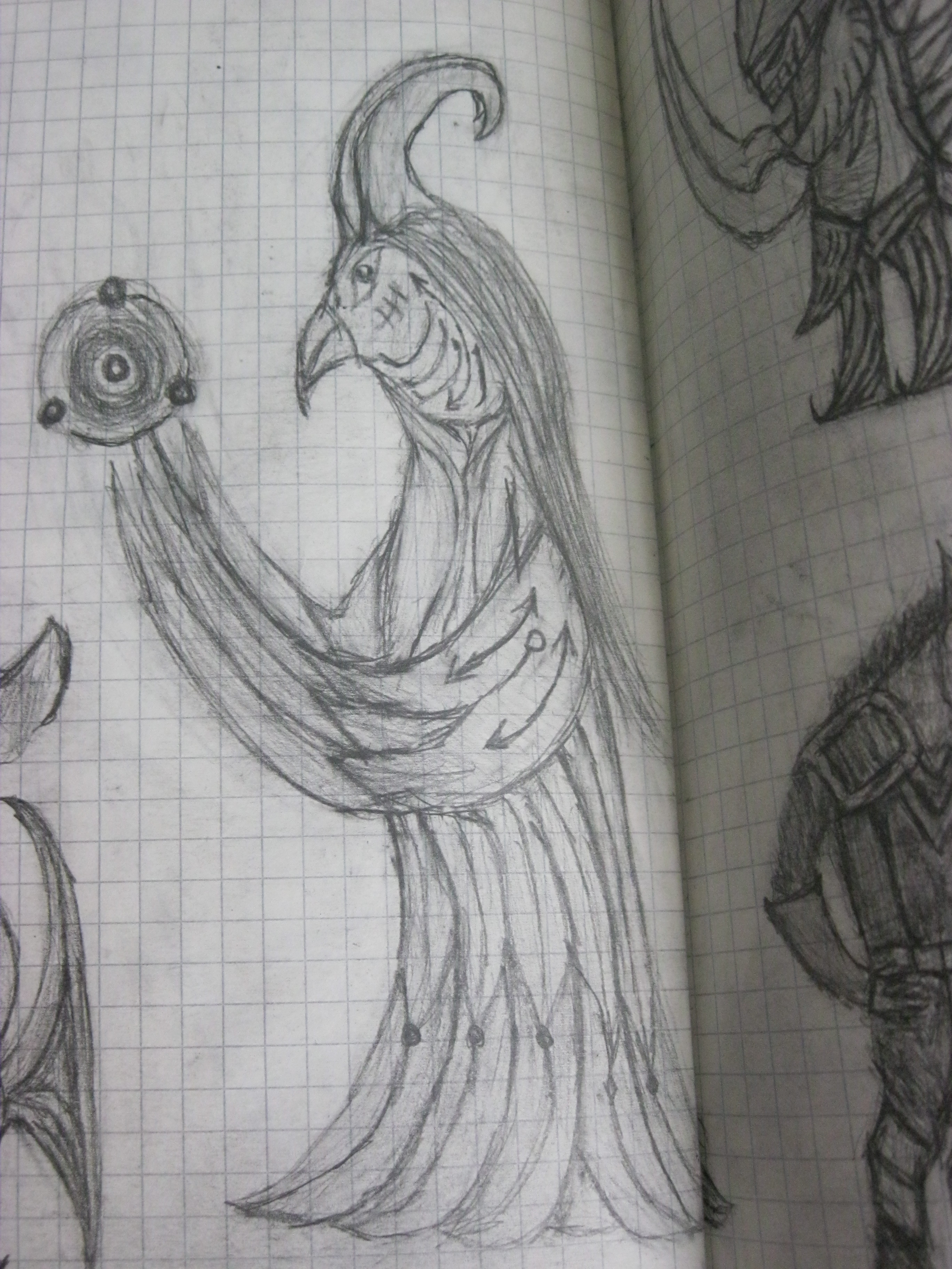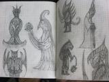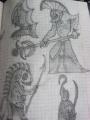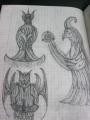 Лист 1: Слева направо: призрак тьмы(весьма криво вышел), птица мудрости(обожаю эту работу, хочу сделать её же уже на A4), ночной страж(немного смахивает на Баланара).