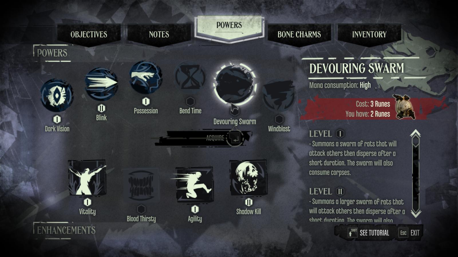Помимо способностей убийцы, сам Корво также владеет особыми колдунствами – то вроде телепортации, чтобы незаметно появится у врага за спиной, или наоборот во всю по тапкам в случае обнаружения. Для прокачки колдунств надо собирать руны Чужого.