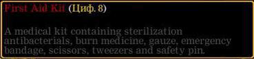 Аптечка. Медленная регенерация здоровья на время. Излечивает различные ушибы, переломы и кровотечение.