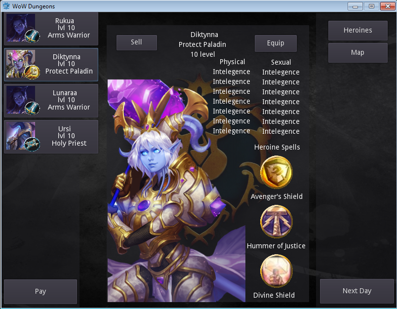 По замыслу представляет из себя гаремник из альянсовских героинь, которых мы посылаем в подземелья. Стилистика, спрайты и т.п. взяты из wow, потому что я не умею рисовать, а картинок по WoW'у в гугле огромное количество.