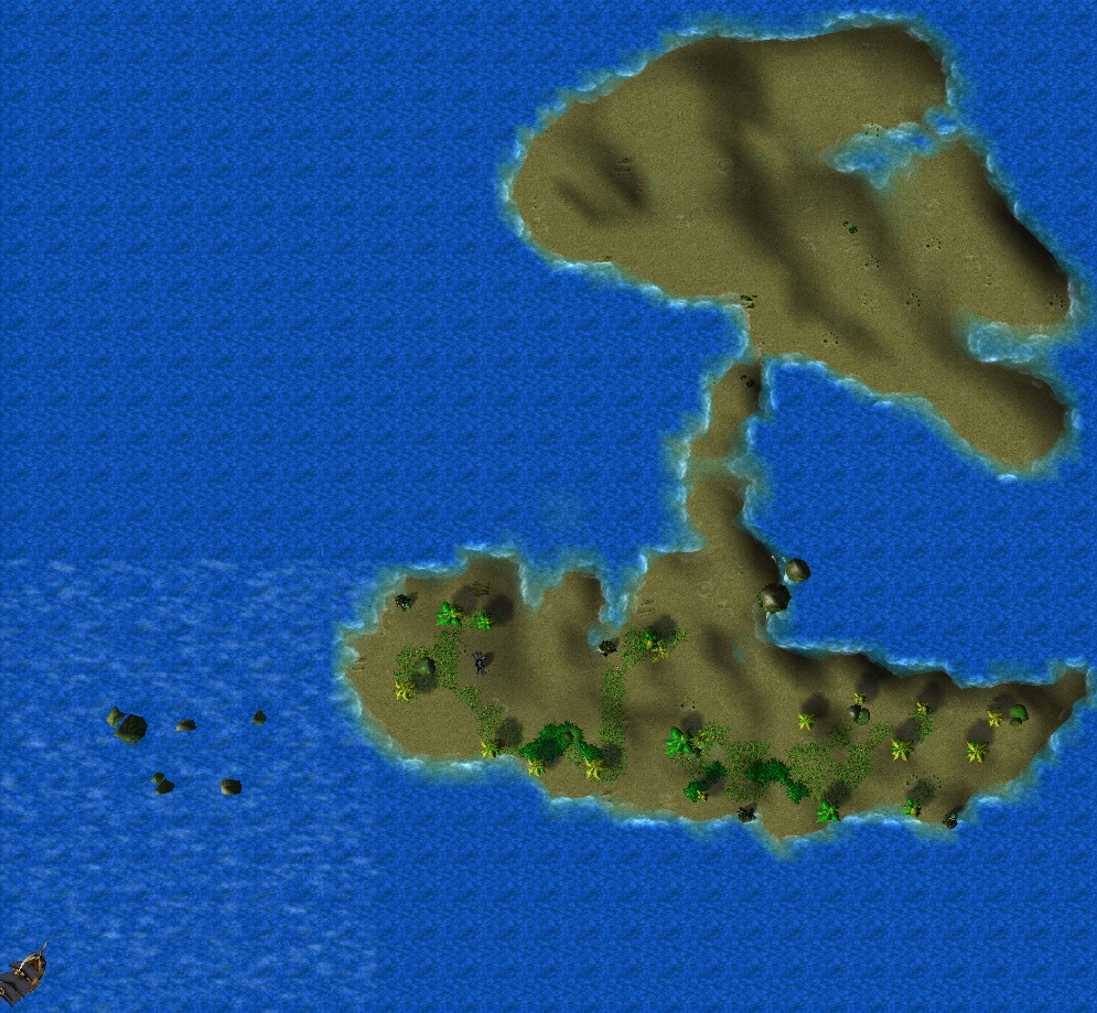 Карта явно на ранней стадии создания, есть пара островов, на которых живут черепахи и крабы, причем на втором острове есть только рельеф. Есть скалы и вертолет с моделью корабля, который видимо должен был на эти самые скалы налететь) Хотя уровень исполнения явно выше чем в той карте из кОмпании про Артеса, скорее всего я делал ее позже.