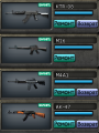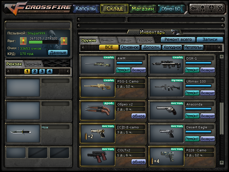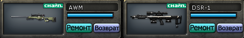 Это я перечислил те оружия, которые у меня постоянно находятся на складе. Вы, наверное, заметили еще некоторые оружия, под названием которых вместо синей полосы (своеобразные "жизни" или срок работы оружия) написан срок пользования (n д., n ч.). Это донатное оружие - т.е. то, которые покупают за деньги или выигрывают при определенных обстоятельствах (например, конкурсы, выполнение миссий или режимы "Зомби"). Свои я часть получил путем выигрыша (MP5-Silenser, SG552-Camo, M16 Scope Camo, PSG-1 Camo, D.E-camo, P228 Camo, Кукри, Дымовая шашка RED), часть - путем покупки за деньги (M4A1-Silencer, Обрез x2, COLTx2, Саперная лопата).
