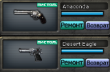 - Desert Eagle - такая же классика, как АВМ или м-ка: мощный и надежный пистолет. Я бы даже сказал, что он не уступает некоторым хорошим винтовкам в качестве. Есть альтернативный вариант - Anaconda, больше урона, но меньше патронов (6 в отличии от 7 у Дезерта). Вроде бы 1 патрон, но часто это может сыграть победу. Поэтому вариант спорный, какой пистолет лучше - я взял два, потому что рюкзаков с оружием у игрока 2, и их в любом случае нужно заполнить в каждом по 1 пистолету. Хочу еще купить пистолет с большим кол-во пуль в обойме - для режима мутации. Но пока еще не определился, какой вообще взять - есть 3 варианта.