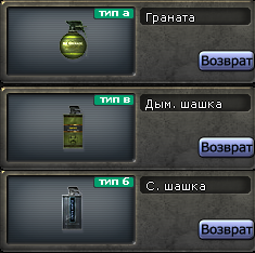 - Граната, Слепящая шашка, Дымовая шашка (из гранат).