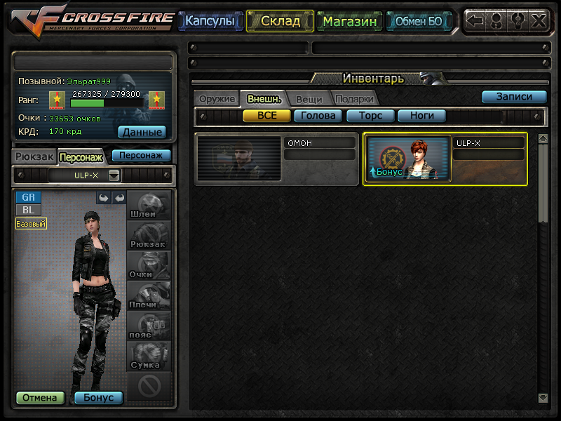 Напоследок, я похвались своим новым персонажем и вещами. Недавно взял себе нового персонажа - солдата-женщину из подразделения ULP-X. У нее есть хороший бонус - в режиме этого персонажа игроку лишь частично мешают дымовые завесы. Правда, минус в том, что хоть она и постоянный персонаж, но покупать ее нужно за деньги - пришлось пожертвовать 1190 кредитов. Так что, помимо стандартного ОМОН-авца у меня еще и женский персонаж есть.
